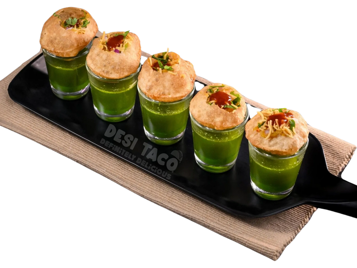 Erleben Sie ein verlockendes Abenteuer mit unseren Pani Puris. Diese knusprigen, hohlen Kugeln sind die Essenz der indischen Straßenesskultur. Gefüllt mit einer Mischung aus gewürzten Kartoffeln, Kichererbsen und gekeimten Linsen, wird jeder Puri auf einem Shotglas serviert, das mit eiskaltem, kräuterhaltigem Minzwasser gefüllt ist. Ein verspieltes und dennoch raffiniertes Gericht, das eine Symphonie von würzigen, sauren und süßen Noten bietet.